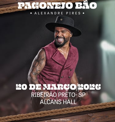 Prepare-se para uma noite inesquecível com muito samba, pagode e sertanejo. Alexandre Pires chega a Ribeirão Preto-SP, no Alcans Hall, no dia 20 de março de 2026, com o show Pagonejo Bão — um espetáculo que une dois estilos musicais que encantam o público brasileiro: o pagode e o sertanejo.